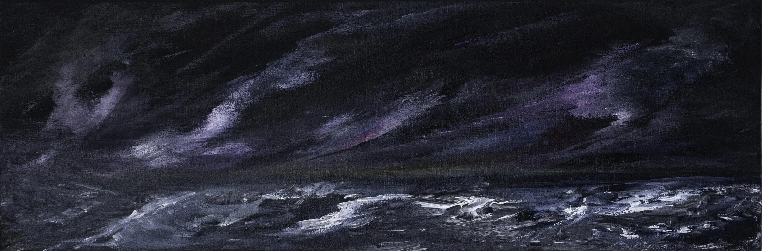 Fionn uses a variety of mediums to create texture, depth of colour and effect. Fast drying oils on an acrylic base produce the fluidity and movement of the sea, sky and ever changing light. She uses palette knives, all sorts of brushes and even kitchen utensils to create the desired effect
